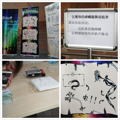 神經(jīng)所科普志愿者分為四支隊伍,通過“電刺激蟑螂腿跳舞”這個實驗,向公眾普及了神經(jīng)系統(tǒng)通過電信號傳遞信息的知識。由于觀眾流動量大,為了確保交通暢通,實驗以演示和知識講解為主,觀眾親自動手為輔,目的在于激發(fā)觀眾的好奇心,感受科技的神奇之處。