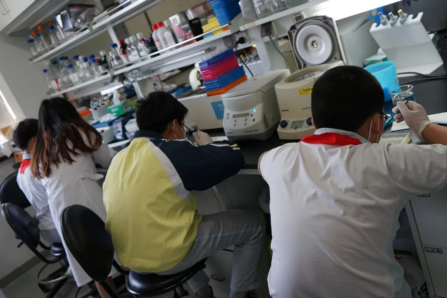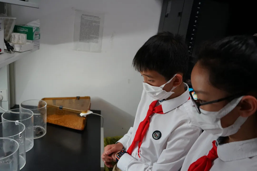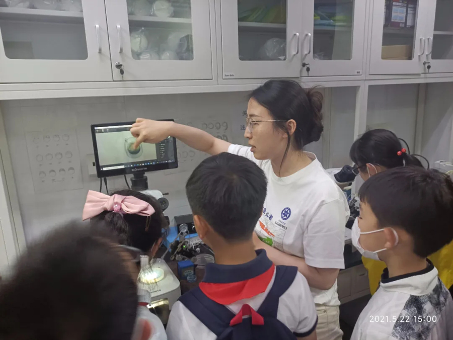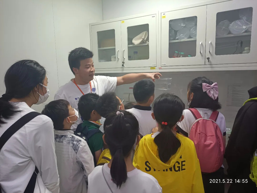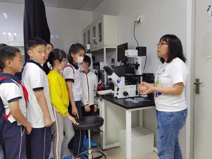 在強調了實驗室安全規范后,科普志愿者將參觀者分為多個小組,帶領他們比較了不同年齡階段線蟲的運動狀態、年輕小鼠與年老小鼠的差異,熟悉了斑馬魚的胚胎發育過程,辨別了斑馬魚的雌雄差異,講解了各種儀器設備的用途,展示了通過光遺傳方法控制小鼠癢覺的過程,并讓他們近距離地觀察了小鼠大腦、斑馬魚的顯微注射和熒光篩選技術。同學們對熒光蛋白在生物學領域的應用有了一個初步的了解,在看到標記有熒光信號的五顏六色的轉基因魚系時,他們表現出對從事科研的向往之情。