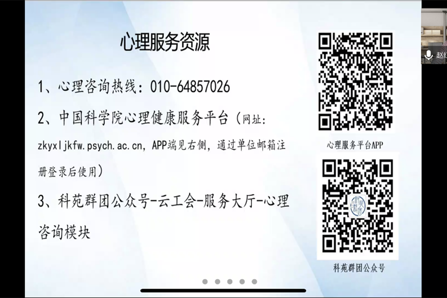 此次培訓(xùn)是中科院工會(huì)2021年職工心理健康主題巡講的一部分,由中科院工會(huì)職工心理健康服務(wù)中心主辦,腦智卓越中心工會(huì)承辦。趙老師娓娓道來的授課方式,拓寬心路的課程內(nèi)容讓大家充滿了正能量, “活在當(dāng)下”的處世理念成功植入到了每位參與培訓(xùn)的職工心中。會(huì)后,職工紛紛表示將把所學(xué)知識(shí)運(yùn)用到科研工作與日常生活中,在逆境中學(xué)會(huì)梳理心情,爭取成為一個(gè)擁有陽光心態(tài)、主動(dòng)提升人生幸福感的人。