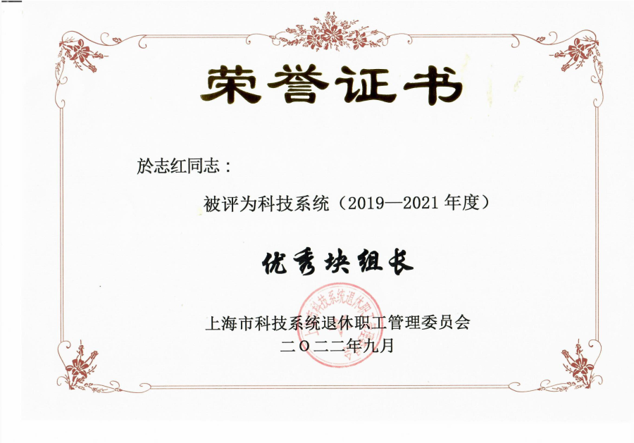 於志紅同志2006年起擔(dān)任中科院腦科學(xué)與智能技術(shù)卓越創(chuàng)新中心(原上海生科院神經(jīng)所)離退休黨支部書(shū)記、退休塊組長(zhǎng),她努力踐行和弘揚(yáng)老干部精神,十幾年來(lái)如一日不辭辛勞為離退休職工服務(wù),不忘初心,發(fā)揮余熱,多次獲得“優(yōu)秀黨員”稱(chēng)號(hào)。
