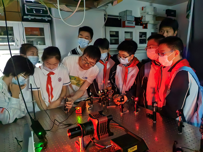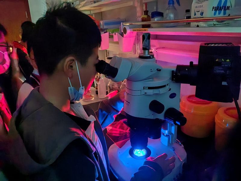 在強調了實驗室安全規范后,科普志愿者將參觀者分為多個小組,帶領他們比較了不同年齡階段線蟲的運動狀態、年輕小鼠與年老小鼠的差異,講解了全息光學成像等多種儀器設備的用途,解讀了利用空間光調制器實現全息三維成像的原理,展示了通過光遺傳方法控制小鼠癢覺的過程,并讓他們近距離地觀察了胚胎的顯微注射。同學們對熒光蛋白在生物學領域的應用有了一個初步的了解,在看到標記有熒光信號的五顏六色的神經組織時,他們表現出對從事科研的向往之情。
