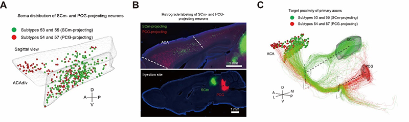 通過對這些神經(jīng)元進行形態(tài)學的分析,團隊發(fā)現(xiàn)小鼠前額葉皮層神經(jīng)元可以分為3個大類。即皮層椎體束神經(jīng)元、皮層內(nèi)投射神經(jīng)元、皮層丘腦束神經(jīng)元。通過對這三大類型神經(jīng)元形態(tài)的深入分析,作者發(fā)現(xiàn)其可以進一步分為64個亞型,不同亞型的神經(jīng)元往往有著不同的胞體分布、神經(jīng)元形態(tài)和投射模式。例如,亞型53和55主要分布于前扣帶回(Anterior Cingular Area, ACA)腦區(qū)的后部且主要投射到上丘的運動相關(guān)腦區(qū)(Superior Colliculus motor related, SCm),而亞型54和57主要分布于ACA腦區(qū)的前部且主要投射到腦橋中央灰質(zhì)(Pontine central gray, PCG)(圖1)。