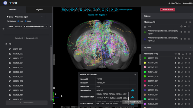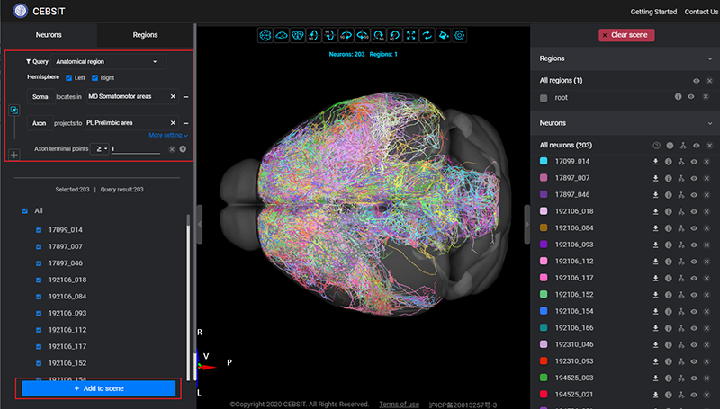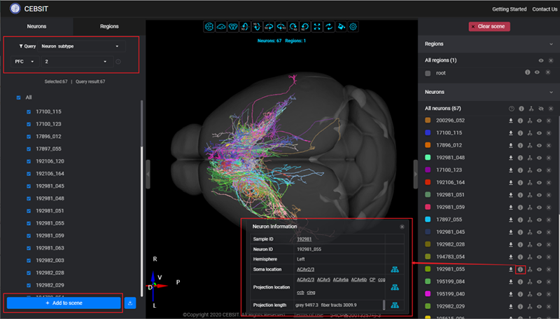 1. 便捷搜索功能:在網(wǎng)頁左側(cè)導(dǎo)航欄提供Neurons和Regions選項,默認顯示選項為Neurons。在Neurons頁,Query下拉框中支持選擇Anatomical region、Neuron subtype、ID等維度查詢。系統(tǒng)默認為Anatomical region維度,用戶可根據(jù)神經(jīng)元的胞體位置、投射情況進行多維度組合檢索自己感興趣的神經(jīng)元,搜索返回結(jié)果將在正下方展示神經(jīng)元的編號。在返回結(jié)果中,勾選需加載的神經(jīng)元編號,點擊底部的Add to scene按鈕后,則選中的神經(jīng)元將以不同的顏色實時渲染到3D腦空間上,并且在右側(cè)展示選中神經(jīng)元的信息,支持查看神經(jīng)元的所屬樣本與投射信息。另外,也支持按照類型進行檢索,并批量實時渲染到視圖中。