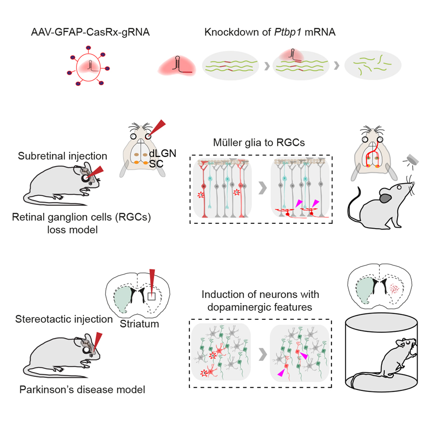 圖注:(上)CasRx通過靶向的降解Ptbp1 mRNA從而實現Ptbp1基因表達的下調。(中)視網膜下注射AAV-GFAP-CasRx-Ptbp1可以特異性的將視網膜穆勒膠質細胞轉分化為視神經節細胞,轉分化而來視神經節細胞可以和正確的腦區建立功能性的聯系,并且提高永久性視力損傷模型小鼠的視力。(下)在紋狀體中注射AAV-GFAP-CasRx-Ptbp1可以特異性的將星形膠質細胞轉分化為多巴胺神經元,從而基本消除了帕金森疾病模型小鼠的運動癥狀。