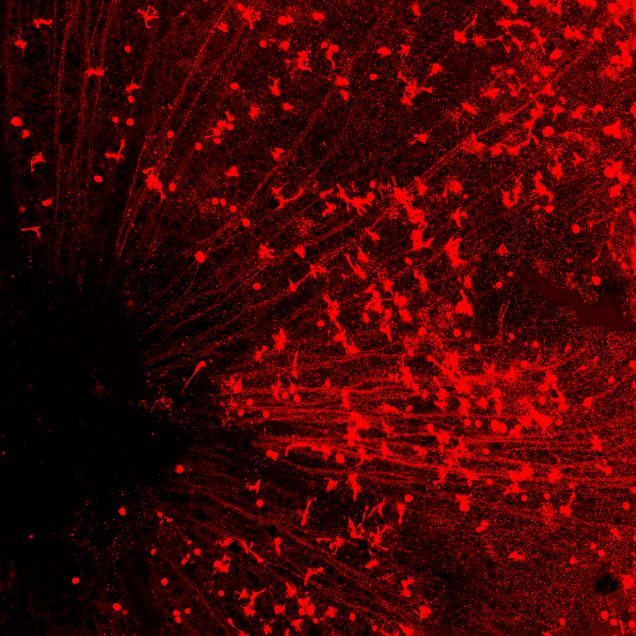 在小鼠的視網膜上,紅色圓形的細胞是再生出的視神經節細胞,可以看到一條一條的紅線匯集到眼睛中間的視盤(左下黑洞區域),這是再生出的視神經節細胞發出的軸突,它們將通過視盤傳到視神經,然后再到大腦。