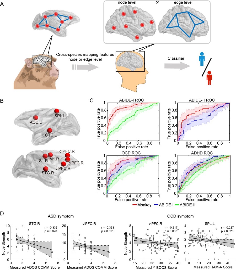 圖注:(A)腦功能連接圖譜的特征構建猴-人跨物種機器學習分類器;(B)在獼猴模型中學習得到的9個腦區;(C)基于9個腦區構建的跨物種機器學習分類器與基于人ASD數據構建的分類器對ASD、OCD和ADHD的分類性能ROC曲線;(D)ASD和OCD共享的神經環路內表型以及與疾病特異的臨床癥狀相關的異常。