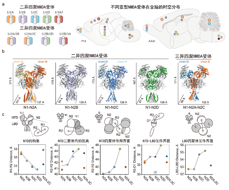 圖1.決定不同NMDA受體功能多樣性的分子基礎(chǔ)。a,不同NMDA亞型在不同發(fā)育階段的全腦分布(引自Paoletti et al., 2013)。b,c,不同NMDA受體亞型的三維結(jié)構(gòu)及決定功能多樣性的結(jié)構(gòu)基礎(chǔ)。