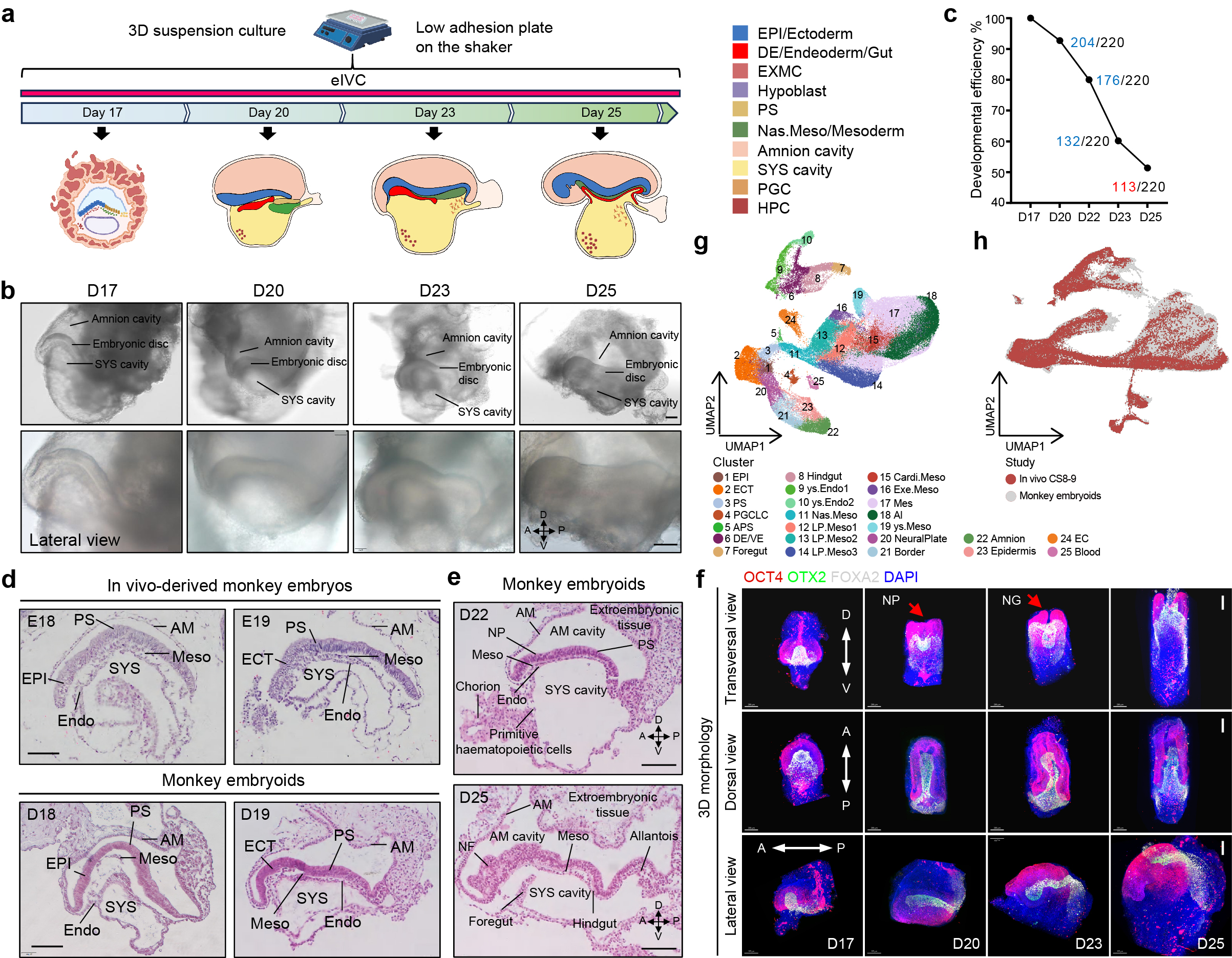 圖1. (a) 猴類胚胎發(fā)育至第25天(D25)的三維懸浮培養(yǎng)系統(tǒng)示意圖。(b) D17至D25猴類胚胎明場(chǎng)圖。(c) D17至D25期間猴類胚胎發(fā)育效率統(tǒng)計(jì)。(d) E18和E19階段天然猴胚胎(上)及D18、D19猴類胚胎(下)的對(duì)比。(e) 猴類胚胎在第22天(D22)和第25天(D25)的H&E染色圖像。(f) D17-D25階段猴類胚胎的3D重構(gòu)圖。(g) UMAP展示猴類胚胎所有細(xì)胞類型的分布。(h)猴類胚胎與CS8-9階段天然猴胚胎的單細(xì)胞整合分析。