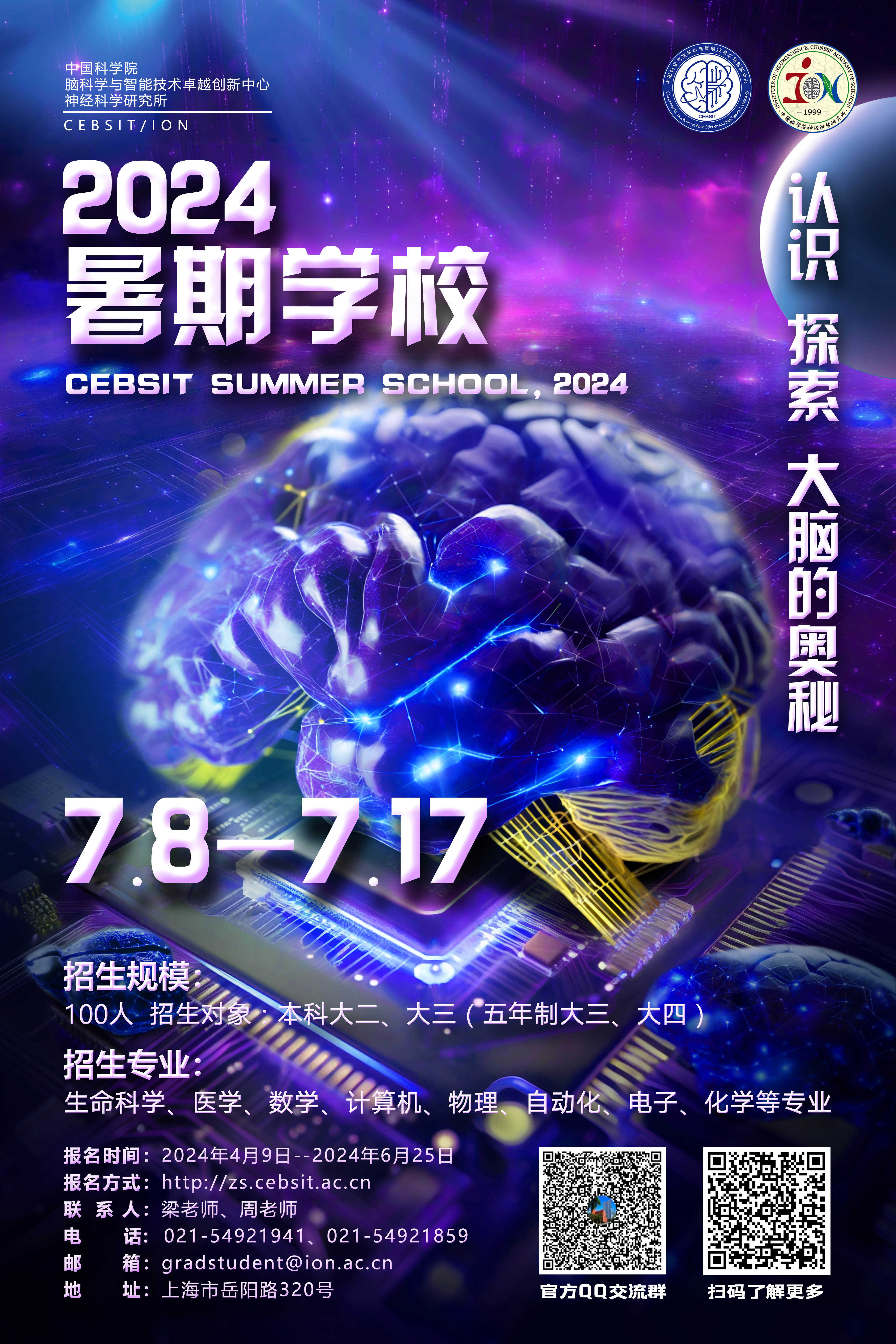 解析大腦的奧秘一直是人類的終極夢想。中國科學院腦科學與智能技術卓越創新中心暑期學校預計將于20247月8 - 717舉行,共招生100人。招生面向大學本科生命科學、醫學、數學、計算機、物理、自動化、電子、化學等專業的二、三年級對腦科學與智能技術感興趣的學生。目的是提高大學生對腦科學與智能技術的認識與興趣,并吸引優秀的大學生加入探索大腦奧秘的行列中,到腦智卓越中心攻讀研究生。